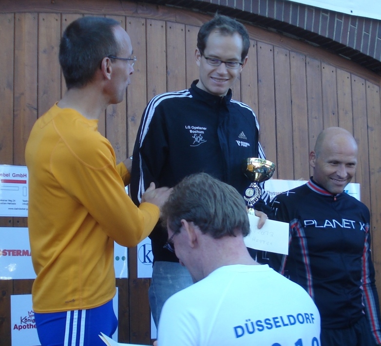 Den sah bei den 'Großen' im Ziel Klaus Eickel als Sieger mit einer Zeit von 2:58:31 Std. "Auf den letzten Kilometern drehte Klaus Eickel nochmal so richtig auf und überholte den führenden Wittener Thomas Wörmann. An den Steigungen war es nicht einfach mitzukommen", berichtet Peter Dümpelmann, der den jeweils Führenden auf dem Fahrrad begleitete. Thomas Wörmann folgte als Zweiter mit einer Gesamtzeit von 3:01:03 Std. mit acht Sekunden Vorsprung vor dem Drittplatzierten Thorsten Domeyer (Bayer Uerdingen). Klare Angelegenheit wieder bei den Marathon-Frauen: Antje Möller, ehemalige PVlerin und seit Jahren in Duisburg zu Hause, lief in ihrer Heimat ihren vierten Sieg in Folge ein und gewann den Marathon in 3:11:42 Std. vor Lisa Joanne Barry (100 Marathon Club/3:20:09 Std.) und Regina Tank (Dortmund/3:38:11 Std.).