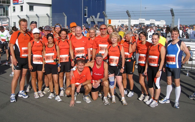 Hölle“, einem Lauf über dem Nürburgring, gefunden. Spektakulär der Start: an gleicher Stelle, wo vor wenigen Wochen noch die Rennboliden aus der Formel 1 das Rennen aufgenommen hatten, traten 1200 Läufer/innen an, um eine herausfordernde 24,4 km lange Strecke in Laufschuhen zu bewältigen. „Boxenstopps und Reifenwechsel hatten wir nicht eingeplant, aber angesichts der sommerlichen Temperaturen mussten wir oft nachtanken“, zieht Jürgen Grühn, Laufmentor des PV-Triathlon, augenzwinkernd den Vergleich zur Formel 1. Die ersten Kilometer bergab fielen leicht, aber was bergab geht, geht irgendwann auch wieder hoch. Ab Kilometer 12 war es dann so weit:...