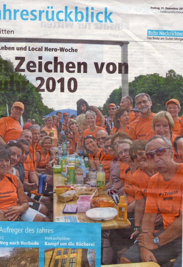 PV-Flame über zwei Tische - die Ruhr Nachrichten drucken auf der Titelseite des Jahresrückblicks das Foto der PV-Gruppe. Aufgenommen wurde es auf der A40-Party: