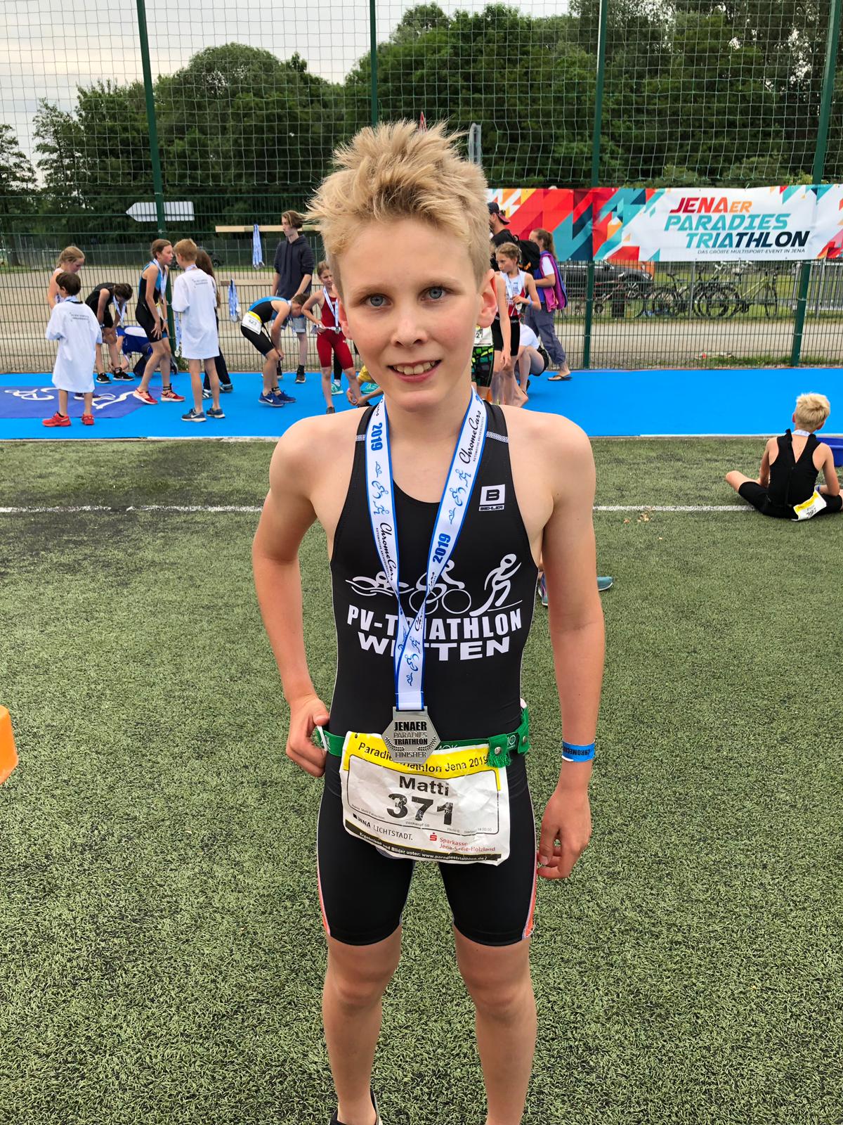 Tüpfelchen auf dem "i" für den PV-Triathlon Witten: außerhalb des DTU-Jugendcups startete Matti Fahrenson im Schülertriathlon über 200 m Schwimmen, 5 km Radfahren und 1 km Laufen. Mit der viertbesten Schwimmzeit, der siebtbesten Radzeit und der besten Laufzeit unter 60 Startern belohnte Matti Fahrenson sich und seinen PV mit dem 2. Platz.