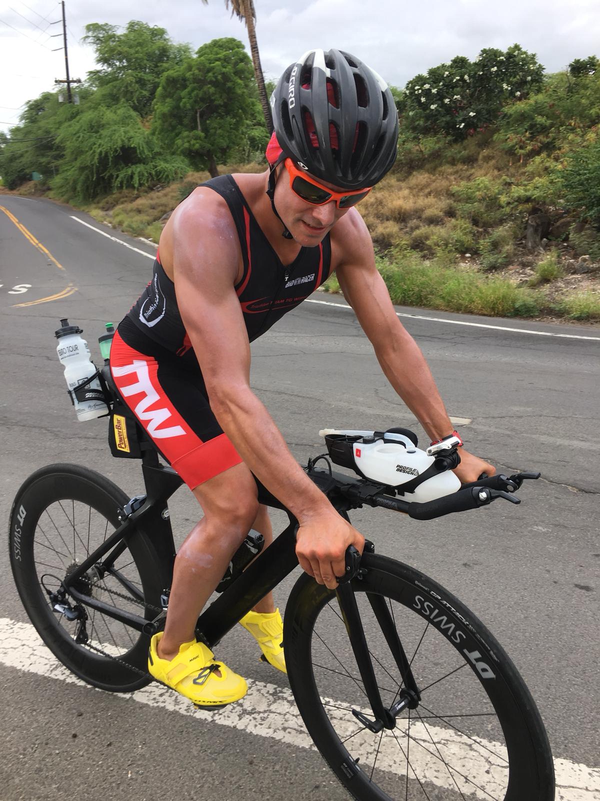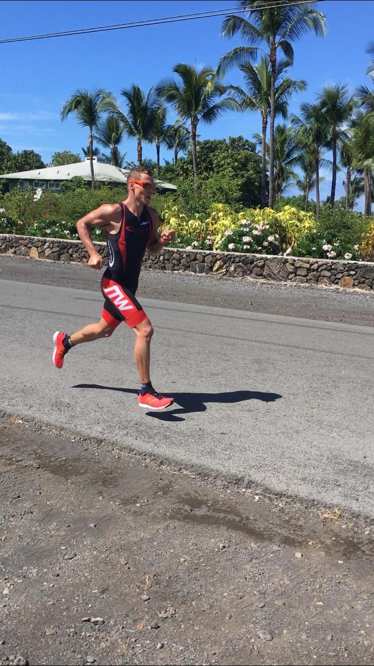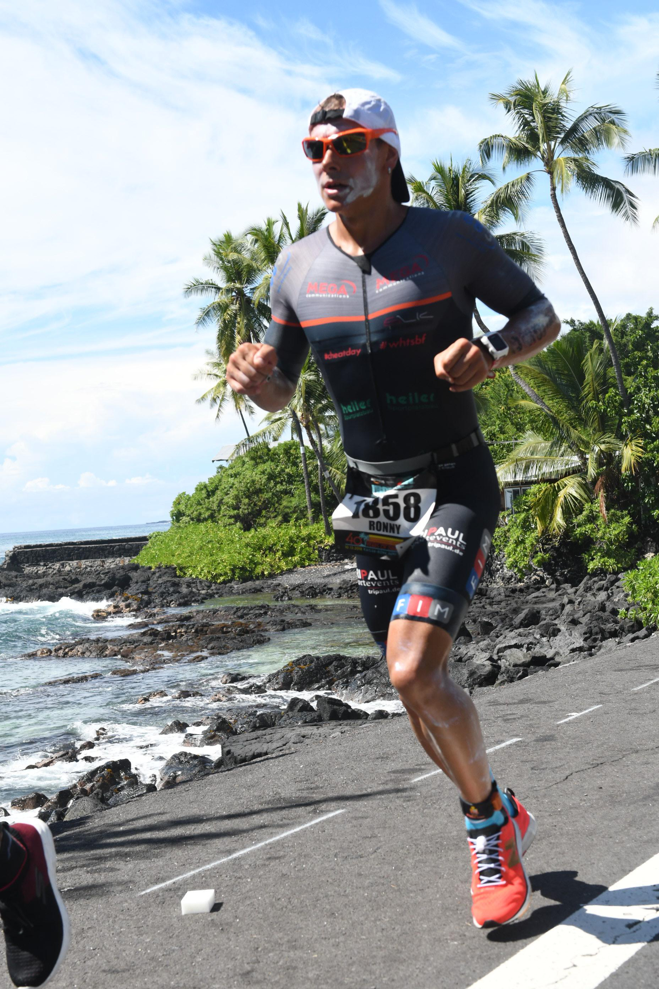 Der Check-In lief tadellos alles war bestens organisiert. Ich hatte einen guten Platz in der Wechselzone der leicht zu finden war. Am Morgen hatte ich noch meine Radflaschen angebracht und die Reifen auf 8 Bar gepumpt. Alles war sehr friedlich und jeder einfach hilfsbereit. Wir hatten Glück denn die Wellen der vergangenen Tage waren deutlich niedriger und so konnte das Rennen im Pazifik starten. Ich hatte mich weiter links positioniert um dem Trubel in der Mitte zu entgehen. Eine sehr gute Entscheidung, ich bin zwar insgesamt 100m mehr geschwommen, aber dafür ohne große Schläge und Tritte. Ich kam gut ins Schwimmen und konnte meine Pace machen. Beim Wechsel war das Zelt einfach extrem voll und mein Einteiler mit den langen, engen Ärmeln war im nachhinein ein Fehler, denn ich konnte ihn der Nässe wegen kaum überziehen. Somit hatte ich einen super langen Wechsel zum Rad. Auf dem Rad lief es sehr gut. Ich bin 100% ohne Windschatten gefahren, leider haben viele diesen wichtigen Punkt für diesen Sport überhaupt nicht ernst genommen und es gab meiner Meinung nach viel Lutscherei auf der Strecke. Die Bedingungen waren dennoch gut, aber ich habe mich trotzdem etwas zurückgehalten. Ich wusste das ich viel Energie noch auf der Laufstrecke benötigen würde. Mittlerweile war es auch wieder super heiß geworden und es war wie immer auf Hawaii. Der Wechsel vom Rad zum Laufen verlief gut, trotzdem merkte ich schon bei den ersten Schritten das mein Magen Darm Bereich nicht wirklich in Ordnung war. Es kam wie es kommen musste. Ich hatte eine Pace von 4:15 und bei Km 6 am Turn am Ali Drive musste ich ins Dixi. Es war nicht möglich weiterzulaufen. Am Anfang dachte ich das es vielleicht nur einmal sein müsste und dann wäre alles wieder gut. Weit gefehlt, denn es ging genau so weiter und nach dem Anstieg an der Palani Road war das nächste Dixi dran. Dazu kam das Problem mit dem Anzug und den langen Ärmeln den man weder aus noch angezogen bekommt. Oberkörper frei in den USA geht aber auch nicht und so wurde es ein extremes Prozedere und ich zweifelte sehr, dass ich es überhaupt noch ins Ziel schaffen würde. Es ging mir richtig schlecht und ich hatte jegliche Energie verloren und ich wusste genau wo. Es war einfach nicht möglich die Speicher wieder aufzufüllen.
