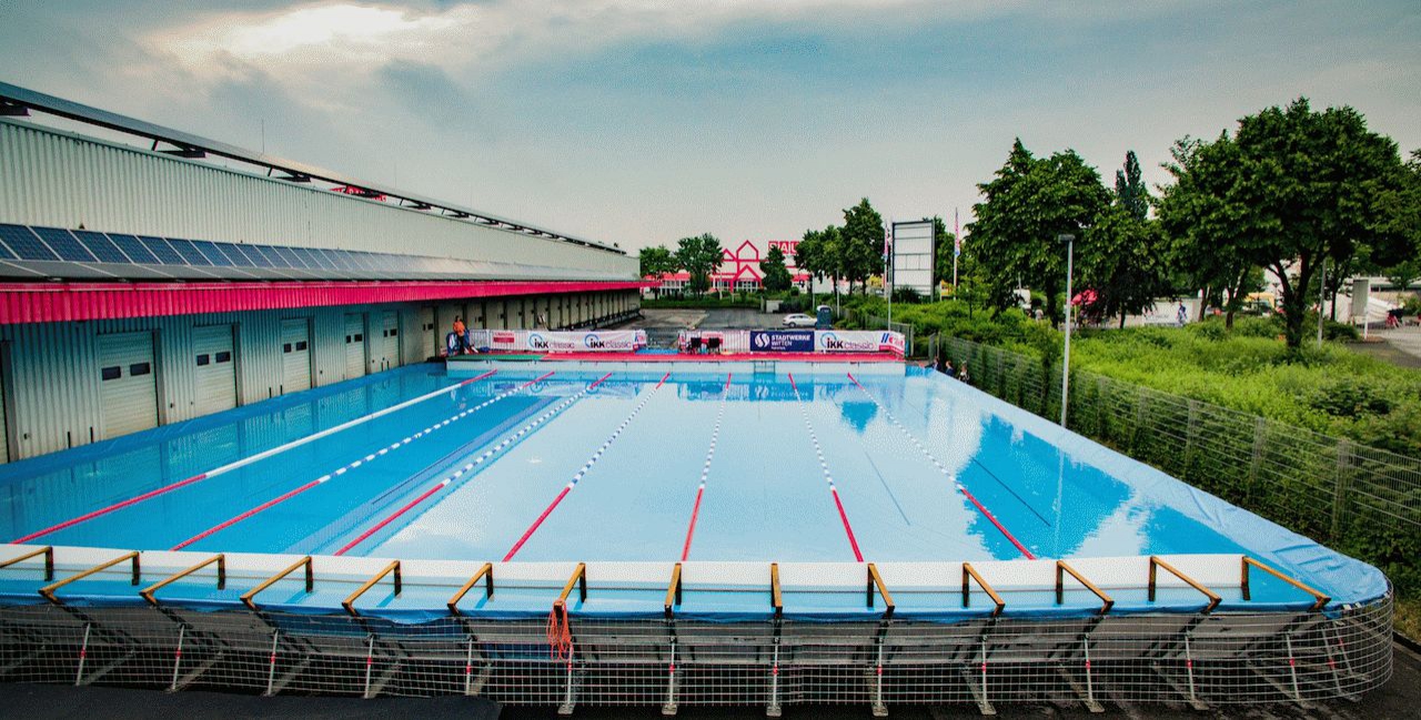 Auf die Teilnehmer warten 500 m Schwimmen im wohltemperierten, mobilen Schwimmbecken.