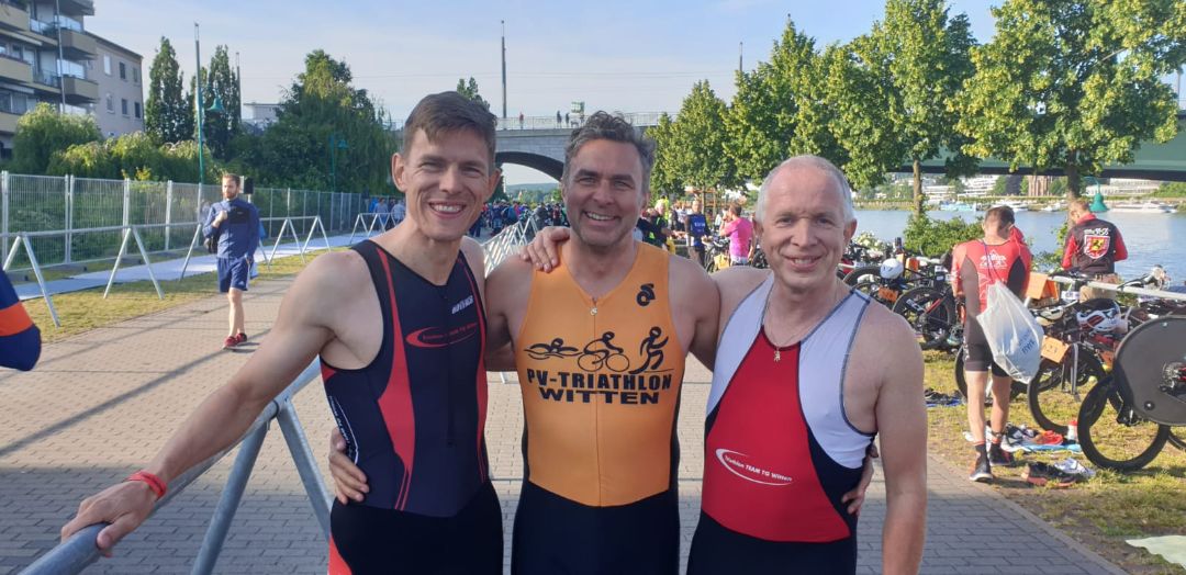 30 Teams gingen bei den Masters ins Rennen, darunter ein Trio mit Tim Aepfelbach, Stephan Haag und Christoph Breucker der SG Triathlon Witten - der Letztgenannte war erst drei Tage vorher eingesprungen und kam so zu seinem ersten Start in der Master-Liga. Hier war es Stephan Haag, der nach 28:38 min. als Erster das Rheinwasser verließ, gefolgt von Tim Aepfelbach, der es schaffte, seinen Vereinskameraden in der Wechselzone zu überholen und vor ihm auf die Radstrecke zu gehen. Tim Aepfelbach überquerte schließlich nach 3:27:05 Std. als 19. die Ziellinie. Stephan Haag (57./3:48:28) und Christoph Breucker (69./3:57:52) folgten und holten zusammen den achtbaren 17. Platz im Mittelfeld. Der nächste Liga-Start für die Master ist am 30.06. in Altena.