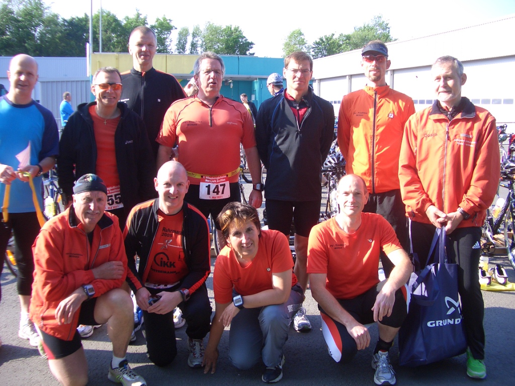 Am 'Tag der Arbeit' verrichtete eine große Gruppe des PV-Triathlon Witten beim 2. Mönchengladbacher Nordpark Duathlon sportliche 'Arbeit'. "Mönchengladbach haben wir als Testwettkampf auf dem Weg zu unserem ersten Triathlon in Oelde eingebaut. 5 km Laufen, 20 km Radfahren und nochmals 2,5 km Laufen waren zu bewältigen, das Schwimmen kommt dann in Oelde noch hinzu", berichtet Stefan Reissland von der gut organisierten Veranstaltung. Mit ihm fanden 190 Starter den Weg in die Fußballstadt am Niederrhein. Den Weg aufs Treppchen fanden Lothar Niemann als Zweiter der M65 (1:21:24 Std.) und Brigitte Hartig als Dritte der W50 (1:26:27 Std.). Während sich zeitgleich Bruno Brahmann den Sieg beim 10 km-Lauf um den Kemnader Stausee holte, finishte Sohn Jörg Brahmann als schnellster PVler in Mönchengladbach mit einer Zeit von 1:02:51 Std. als Sechster der M45. Jörg Brahmann hatte vor allem die Laufstrecken über 5 km mit einer Zeit von 17:57 min. und über 2,5 km mit einer Zeit von 9:07 min. sehr schnell absolviert. Seine Radzeit über 20 km betrug 35:26 min. Die weiteren Ergebnisse: Ralf Wolff (1:04 Std./10. M45), Frank Blasey (1:05 Std./14. M40), Stefan Reissland und Andreas Kapka (beide 1:09 Std./20. M45 bzw. 6. M50), Thomas Rimpel (1:12 Std./12. M50), Volker Eidmann (1:13 Std./14. M50), Hans-Peter Otto (1:18 Std./19. M50) und Ulrich Knepper (1:21 Std./23. M50).