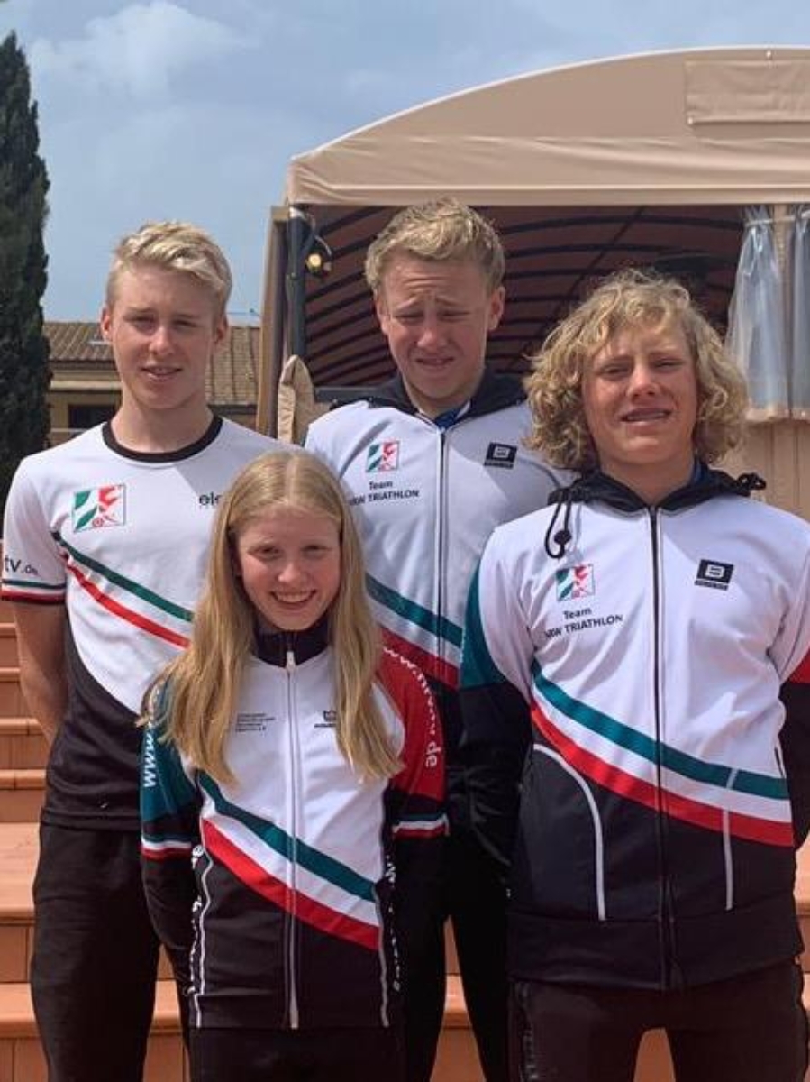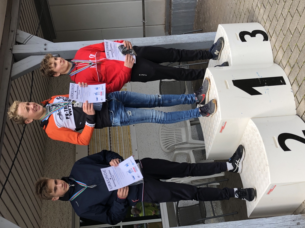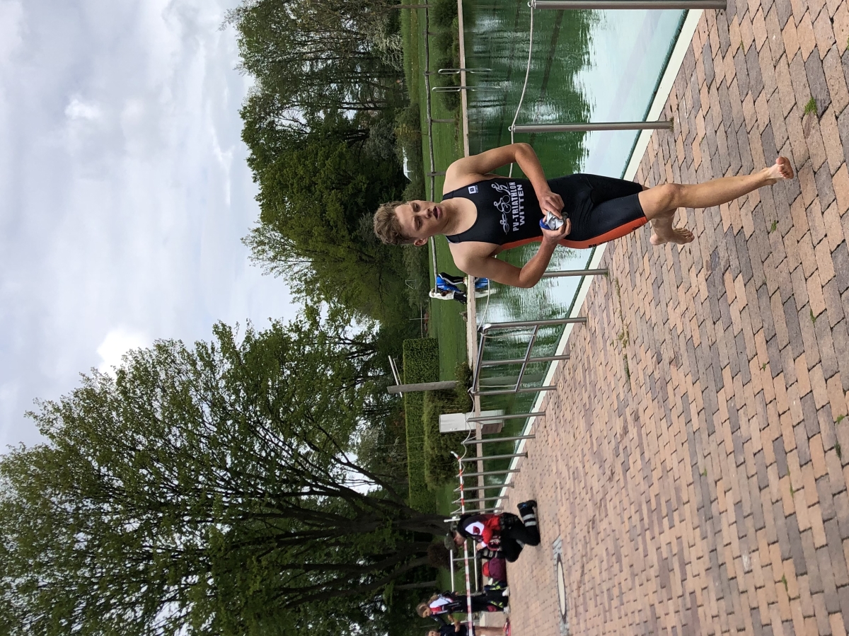 Bereits um 8:00 Uhr morgens ging die männliche Jugend A über jeweils zweimal 300 m Schwimmen, 6 km Radfahren und 1,2 km Laufen ins Wasser. Für den PV am Start waren die NRW-Kaderathleten Luca Fahrenson und Max Meckel sowie der ebenfalls für die DTU-Serie qualifizierte Germann Skobelcin am Start. Luca Fahrenson und Max Meckel zeigten sich trotz der frühen Uhrzeit ausgeschlafen und fanden sich nach ordentlichem Schwimmen in der ersten größeren Radgruppe wieder, die die drei führenden Athleten verfolgte. Luca Fahrenson konnte diese Gruppe auch nach dem zweiten Schwimmen halten, zeigte auch beim zweiten Radfahren und Laufen eine sehr starke Leistung und wurde in 34:23 min. sehr guter Sechster. Kleines Malheur dagegen bei Max Meckel, der einen Radschuh in der Wechselzone verlor und so mit etwas Verspätung auf die Radstrecke ging. Der PVler zeigte aber Moral und wurde nach einer guten Laufleistung am Ende mit dem 14. Platz belohnt (35:08 min.). Germann Skobelcin kam mit den Bedingungen etwas weniger gut zurecht, kämpfte sich aber bis zum Ende durch und schloss das Rennen in 41:05 min. als 51. ab.