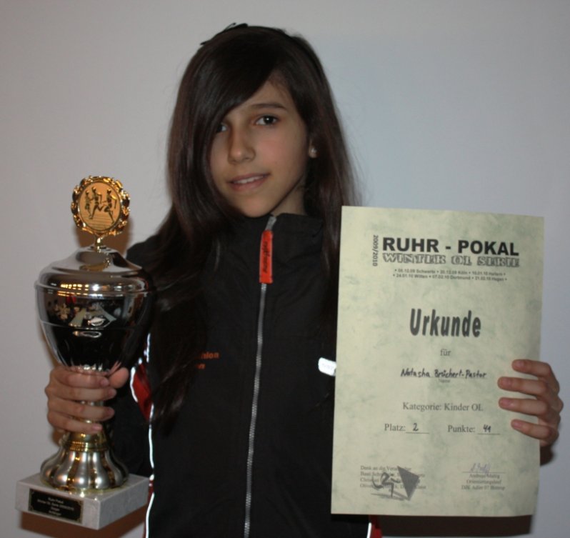 Da das Wetter dieses Jahr das sonntägliche Radtraining nicht immer ermöglichte, startete Natasha Brüchert-Pastor beim Winter-Cup der Orientierungsläufer. Der Cup fand unter anderen in Witten, Dortmund, Hagen und Schwerte in den Monaten Dezember, Januar und Februar statt. Er führte die Läufer, ausgerüstet mit Kompass, Landkarte und Kontrollkarte, quer durch Wiesen und Wälder, um einen bestimmten Kurs in möglichst kurzer Zeit zu absolvieren. Der jungen Triathletin vom PV Triathlon Witten machten die Läufe durch Schnee, Matsch und Gehölz nicht nur einen riesen Spaß, sie war auch äußerst Erfolgreich und konnte den zweiten Platz des Orientierungslauf-Winter-Cups mit großer Freude für sich verbuchen.