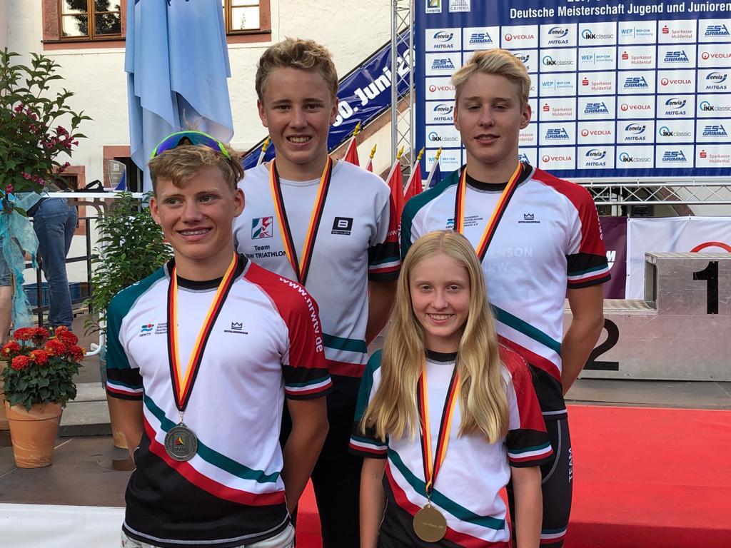 Zum Auftakt starteten Luca Fahrenson, Max Meckel, Joel Hermes (alle 2002) und Lina Franczyk (2003) bei der Jugend A über die Distanzen 750 m Schwimmen, 20 km Rad und 5 km laufen. Bereits nach dem Schwimmen konnten sich Luca Fahrenson und Max Meckel nach 9:52 min. deutlich von der Konkurrenz lösen. Nach gemeinsamen 20 km auf dem Rad hatte Luca Fahrenson abschließend die besseren Beine und lief mit einer Zeit von 56:22 min als neuer Landesmeister über die Ziellinie. Max Meckel folgte in der Zeit von insgesamt 57:00 min auf Platz 2 und machte somit den Doppelsieg für den PV perfekt. Bei den jungen Damen belegte Lina Franczyk in 1:10 Std den guten 9. Platz. Joel Hermes musste den Wettkampf mit gesundheitlichen Gründen leider vorzeitig beim Rad fahren beenden.