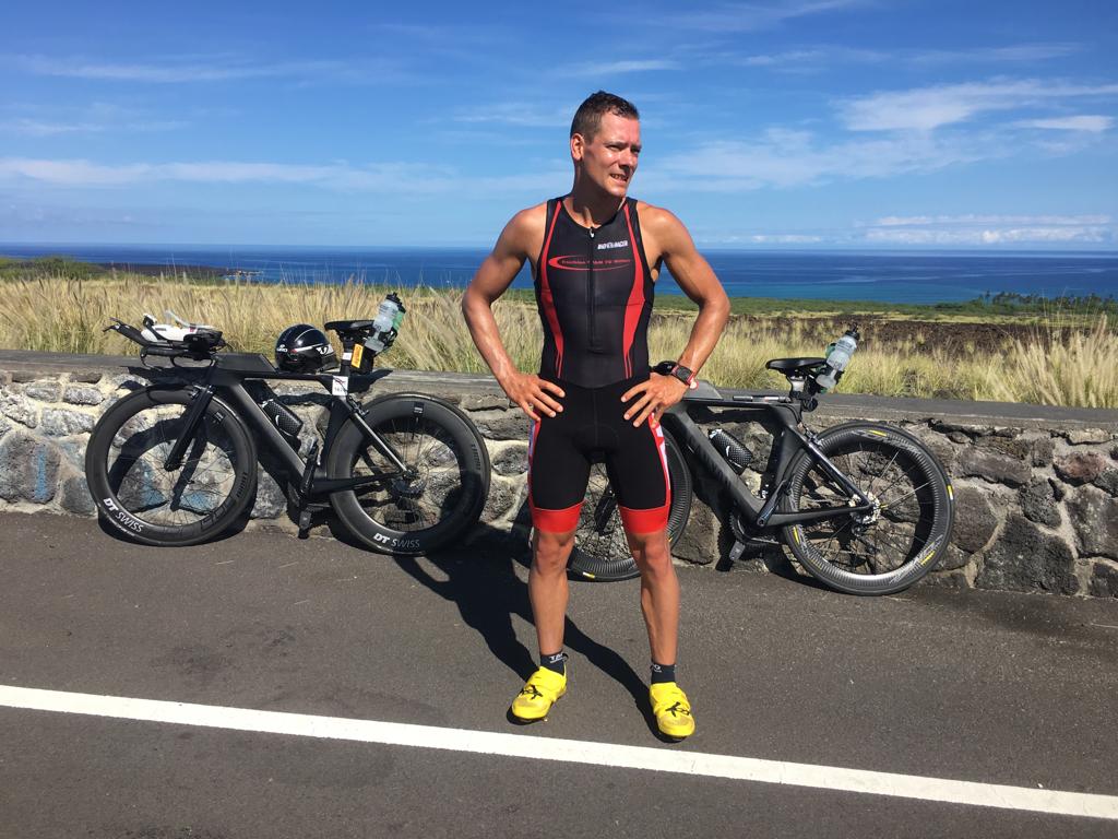 Der Check-In lief tadellos alles war bestens organisiert. Ich hatte einen guten Platz in der Wechselzone der leicht zu finden war. Am Morgen hatte ich noch meine Radflaschen angebracht und die Reifen auf 8 Bar gepumpt. Alles war sehr friedlich und jeder einfach hilfsbereit. Wir hatten Glück denn die Wellen der vergangenen Tage waren deutlich niedriger und so konnte das Rennen im Pazifik starten. Ich hatte mich weiter links positioniert um dem Trubel in der Mitte zu entgehen. Eine sehr gute Entscheidung, ich bin zwar insgesamt 100m mehr geschwommen, aber dafür ohne große Schläge und Tritte. Ich kam gut ins Schwimmen und konnte meine Pace machen. Beim Wechsel war das Zelt einfach extrem voll und mein Einteiler mit den langen, engen Ärmeln war im nachhinein ein Fehler, denn ich konnte ihn der Nässe wegen kaum überziehen. Somit hatte ich einen super langen Wechsel zum Rad. Auf dem Rad lief es sehr gut. Ich bin 100% ohne Windschatten gefahren, leider haben viele diesen wichtigen Punkt für diesen Sport überhaupt nicht ernst genommen und es gab meiner Meinung nach viel Lutscherei auf der Strecke. Die Bedingungen waren dennoch gut, aber ich habe mich trotzdem etwas zurückgehalten. Ich wusste das ich viel Energie noch auf der Laufstrecke benötigen würde. Mittlerweile war es auch wieder super heiß geworden und es war wie immer auf Hawaii. Der Wechsel vom Rad zum Laufen verlief gut, trotzdem merkte ich schon bei den ersten Schritten das mein Magen Darm Bereich nicht wirklich in Ordnung war. Es kam wie es kommen musste. Ich hatte eine Pace von 4:15 und bei Km 6 am Turn am Ali Drive musste ich ins Dixi. Es war nicht möglich weiterzulaufen. Am Anfang dachte ich das es vielleicht nur einmal sein müsste und dann wäre alles wieder gut. Weit gefehlt, denn es ging genau so weiter und nach dem Anstieg an der Palani Road war das nächste Dixi dran. Dazu kam das Problem mit dem Anzug und den langen Ärmeln den man weder aus noch angezogen bekommt. Oberkörper frei in den USA geht aber auch nicht und so wurde es ein extremes Prozedere und ich zweifelte sehr, dass ich es überhaupt noch ins Ziel schaffen würde. Es ging mir richtig schlecht und ich hatte jegliche Energie verloren und ich wusste genau wo. Es war einfach nicht möglich die Speicher wieder aufzufüllen.